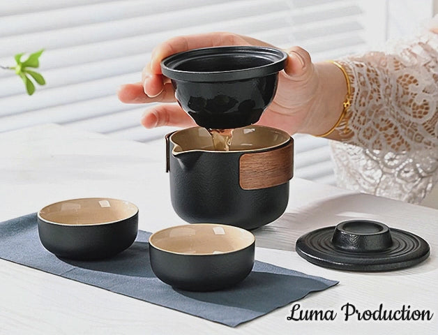 "Whether you're unwinding in the comfort of your home, enjoying a tea break amidst the dunes of a desert landscape, or sharing a cultural moment with friends during your travels, the Eternal Flow Travel Tea Set offers a serene and elegant tea experience. Its compact ceramic design, complete with a teapot and two cups, brings the beauty of nature and the spirit of exploration into your daily ritual, no matter where you are."